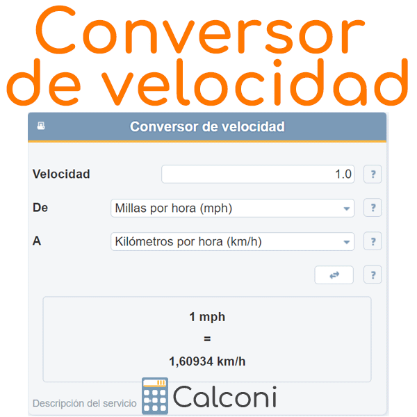 Conversor de Velocidad Introduzca la velocidad a convertir, elija la unidad de velocidad de origen y la de destino en la que desea obtener la conversión. El conversor de velocidad proporciona métricas estándar, las medidas de velocidad angloamericanas, náuticas y astronómicas se utilizan comúnmente para los cálculos. Se puede encontrar información adicional sobre las diferentes unidades de velocidad haciendo clic en el signo de interrogación de la calculadora.