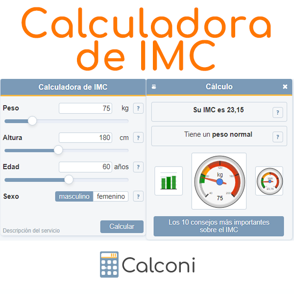 Con la Calculadora de IMC puede calcular su índice de masa corporal. En realidad, este índice es una medida para evaluar su peso en relación con su altura. La calculadora de IMC también lo ayuda a evaluar su peso actual en función de su sexo y su edad. El IMC se calcula de la siguiente manera: IMC = peso en kilogramos / (altura en metros)². Sin embargo, esta medición por sí sola no es suficiente. Para una evaluación correcta del IMC es crucial tener en cuenta el sexo y la edad, solo entonces se puede clasificar el peso y responder a la pregunta más importante: ¿tiene usted un peso inferior al normal, sobrepeso o un peso normal? La calculadora de IMC también lo ayuda a determinar su peso ideal.