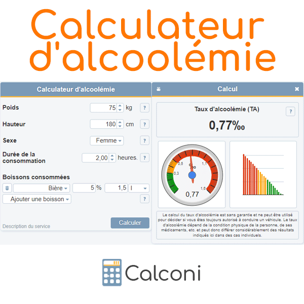 Veuillez noter que le calcul du taux d'alcoolémie (TA) est sans garantie et n'est pas utilisé pour décider si vous pouvez toujours conduire un véhicule. Le taux d'alcoolémie dépend de la condition physique de l'individu, des médicaments et du traitement, etc. et peut donc différer considérablement des résultats présentés ici dans des cas individuels. Parfois, le taux d'alcoolémie est également appelé "teneur en alcool dans le sang" au lieu de "concentration d'alcool dans le sang".