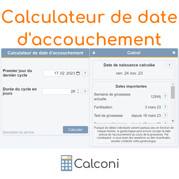 Déterminez la date prévue de votre accouchement à partir du premier jour de vos dernières règles et de la durée moyenne du cycle avec notre calculateur de date d'accouchement. La saisie de nombreuses autres données, telles que la date de fécondation, les dates des phases de développement de l'enfant, font de ce calculateur un outil d'information complet pour les futurs parents.