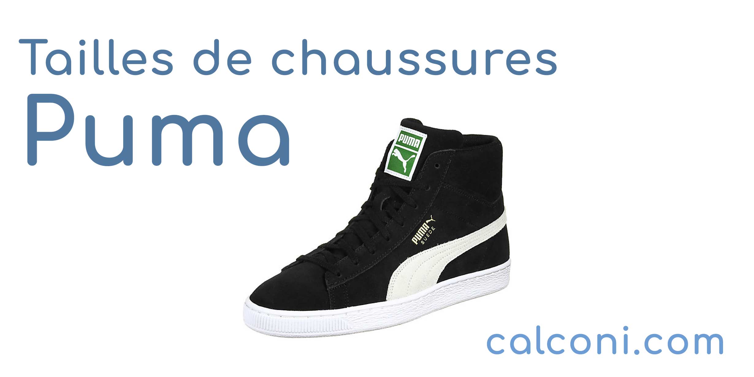 Le tableau de tailles suivant est le même que celui publié par PUMA pour les chaussures pour femmes et pour hommes. PUMA ne fait aucune distinction entre les pointures des chaussures pour femmes et celles des chaussures pour hommes, à l'exception de l'indication des pointures US.