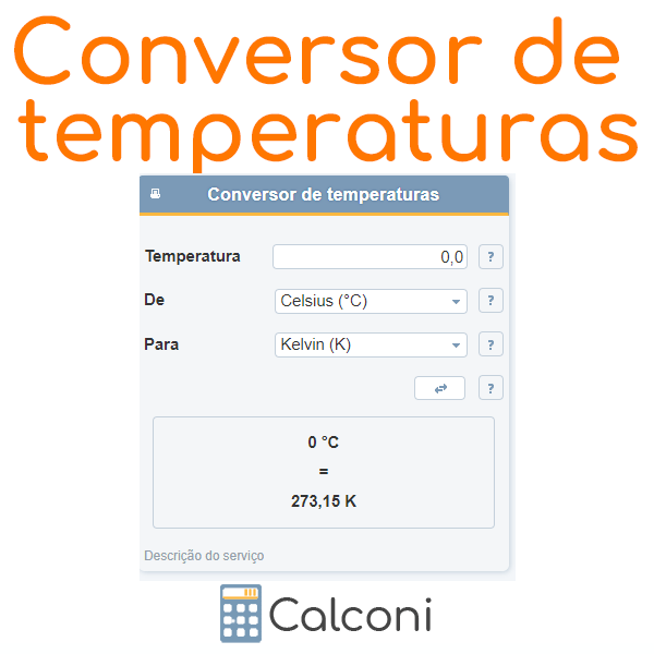 Introduza o valor de temperatura a converter e selecione de e para qual unidade de temperatura este valor será convertido. O conversor de temperatura fornece, para o cálculo, as unidades comuns do SI e as unidades de temperatura anglo-americanas mais comuns. Podem ser encontradas mais informações sobre as várias unidades de temperatura atrás dos botões de ajuda da calculadora de temperatura, marcados com um ponto de interrogação.