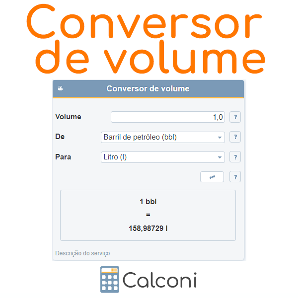 Introduza o volume a ser convertido e selecione de e para que unidade de volume este valor será convertido. O conversor de volume fornece, para o cálculo, as unidades de volume métricas comuns e as anglo-americanas mais comuns. Mais informações sobre as várias unidades encontram-se escondidas atrás dos botões de ajuda da calculadora, marcados com um ponto de interrogação.