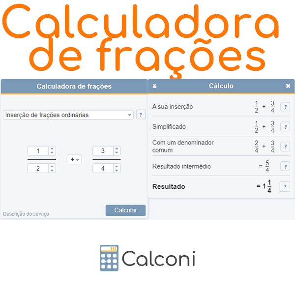 Com a ajuda da calculadora de frações, duas frações podem ser juntas utilizando as nossas quatro operações aritméticas básicas. Tanto frações apropriadas como mistas podem ser adicionadas, subtraídas, multiplicadas ou divididas. Todas as transformações de frações adequadas para o cálculo do resultado são exibidas e explicadas passo-a-passo na janela de resultados.