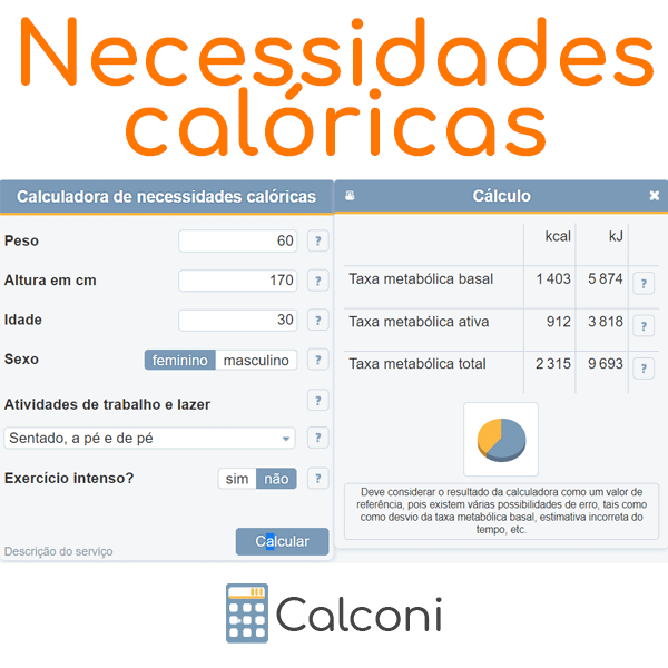 Gostaria de saber qual é a sua necessidade calórica diária? Com a calculadora de necessidades calóricas, pode calcular as suas necessidades calóricas individuais. A calculadora de necessidades calóricas determina a sua taxa metabólica basal diária e a taxa metabólica ativa.