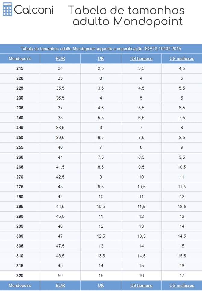 | Mondopoint | Comprimento do pé, polegadas | Comprimento do pé, cm | EUR | UK | US |