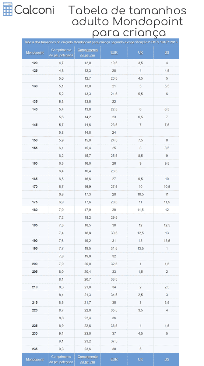 Tabela de tamanhos Mondopoint para criança para imprimir