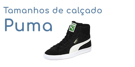 Aqui, pode obter as tabelas de tamanho de calçado PUMA para converter tamanhos EUR, tamanhos UK, tamanhos US para mulher, tamanhos US para homem e o comprimento do pé. Os tamanhos de calçado PUMA são diferentes dos tamanhos de calçado Isso que o nosso conversor de tamanho de calçado utiliza como norma para as conversões gerais do tamanho de calçado. A PUMA publica a sua respetiva tabela de conversão para todos os tamanhos de calçado PUMA, de forma que possa encontrar o tamanho de calçado apropriado, particularmente quando faz compras online. De seguida, apresentamos-lhe a tabela de tamanhos de calçado PUMA para mulher e homem, bem como outras tabelas de tamanhos de calçado PUMA para criança, tal como também são publicadas internacionalmente pela Amazon, entre outras.