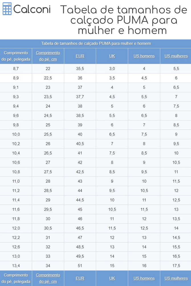 A seguinte tabela de tamanhos de calçado é igual à tabela de tamanhos publicada pela PUMA para o calçado de mulher e homem. A PUMA não estabelece quaisquer distinções entre os tamanhos de calçado de mulher e os tamanhos de calçado de homem, exceto a indicação para os tamanhos de calçado US.