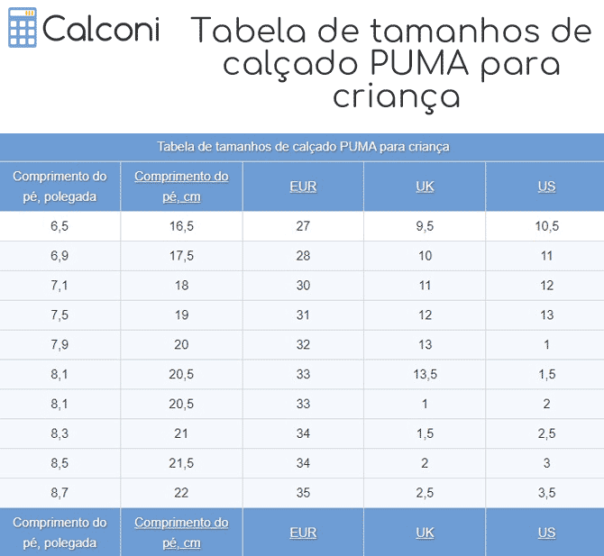 Esta tabela de tamanhos de calçado exibe-lhe a tabela de tamanhos PUMA para calçado de criança retirada da original.