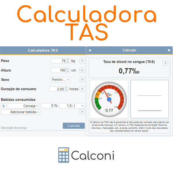 Note que o cálculo da taxa de álcool no sangue (TAS) não é garantido e não é utilizado para decidir se ainda pode conduzir um veículo. A TAS depende da condição física do indivíduo, medicação/tratamento, etc. e pode, portanto, diferir muito dos resultados aqui apresentados em certos casos. Às vezes, a TAS também é referida como "teor de álcool no sangue" em vez de "taxa de álcool no sangue".