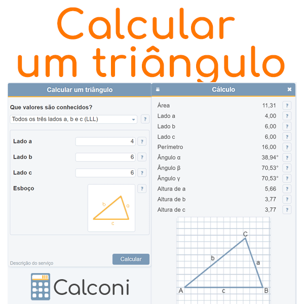 Tudo sobre o triângulo e o seu cálculo: definições, fórmulas e cálculos da área, comprimentos dos lados, perímetro, ângulos e alturas do triângulo. A calculadora de triângulos calcula todas estas propriedades utilizando apenas algumas informações necessárias. Todos os valores do triângulo calculado e do triângulo construído desta forma são exibidos no resultado da calculadora de triângulos. Cada cálculo é obtido utilizando a devida fórmula nos “textos de ajuda” da calculadora de triângulos.